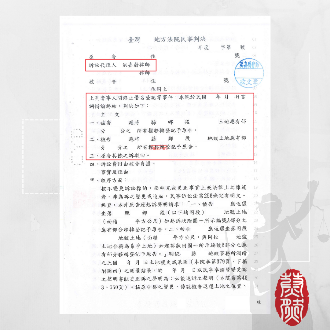 借名登記關係通常會發生在親屬之間,而親屬間基於互信關係及便宜行事,往往不會特別訂立書面的借名登記契約,縱使有書面契約往往因為記載不清楚或記載錯誤而導致許多借名人要終止借名登記契約並請求出名人返還借名登記物時,遭到出名人狠狠拒絕的案例。縱使本件有簽立借名登記契約,但因為範圍不明確,地政機關測量數字結果均不相同,幸好洪嘉蔚律師憑藉多年不動產糾紛處理經驗,還原當時借用之緣由,輔提供相關借名登記文件,最終說服法院成功爭取返還借名登記之不動產。